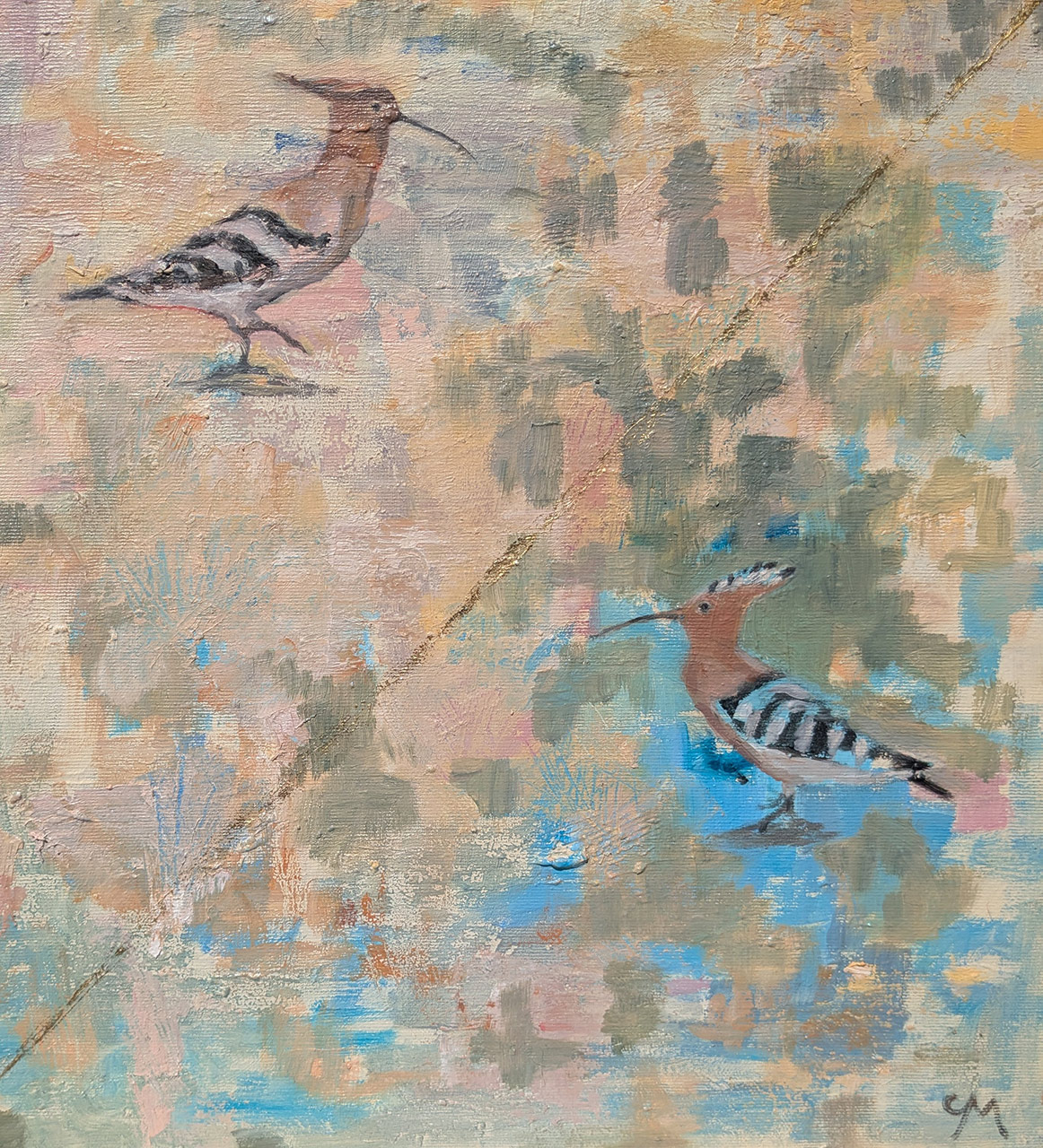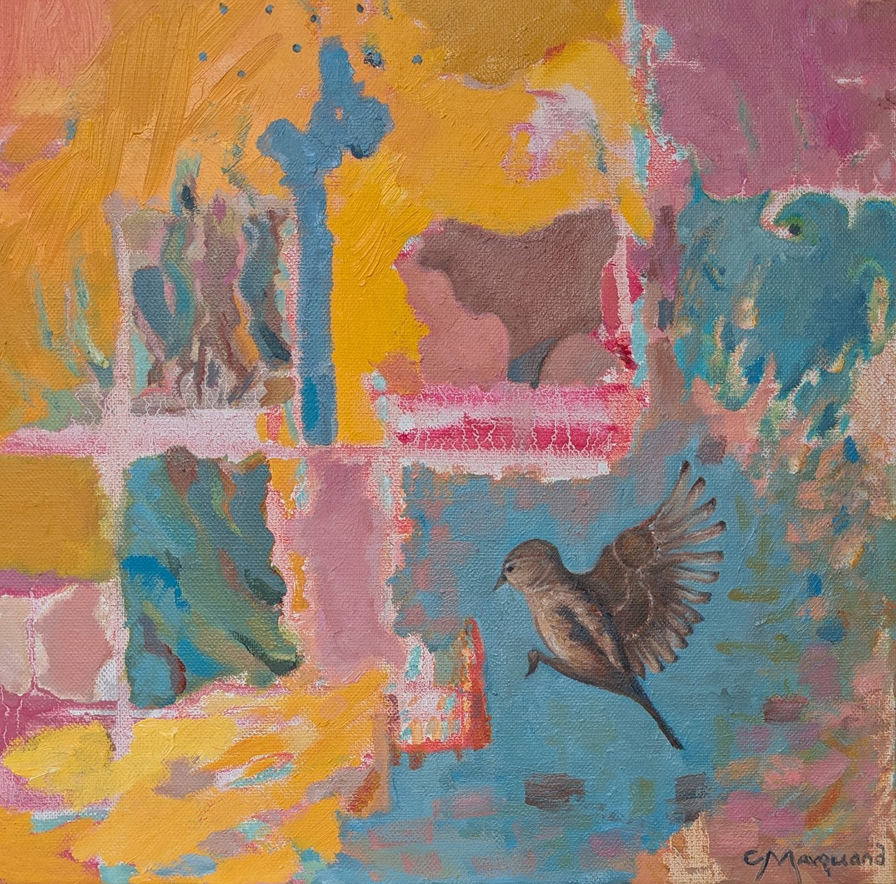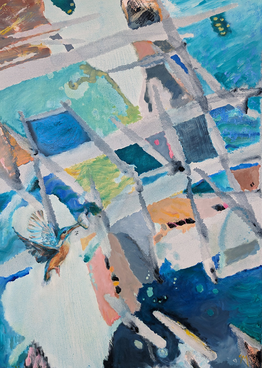 A bird (a sparrow photographed in Crete) emerges against an abstract background: metaphor for a threatened habitat. Through this interplay of form and paint, I invite the viewer to marvel at the creature and reflect on nature’s shifting balance.